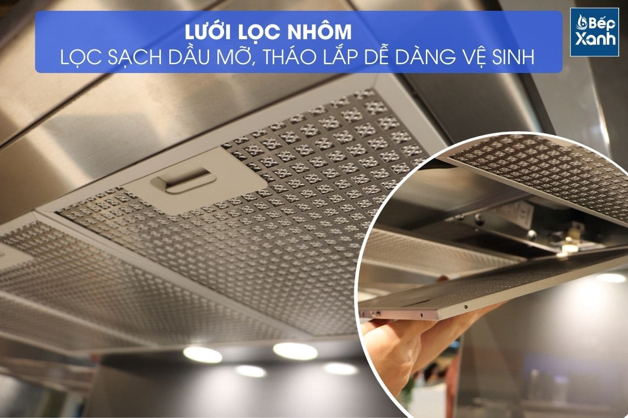 Lưới lọc hợp kim nhôm, dễ dàng tháo ra vệ sinh mọi lúc.