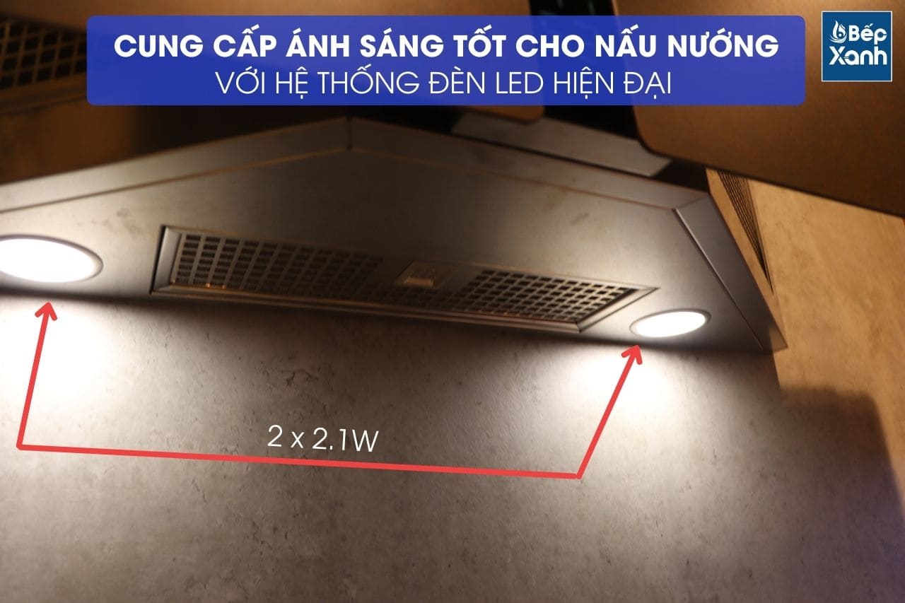 Máy hút mùi được trang bị 2 đèn LED công suất mỗi bóng 2.1W mang đến sự ấm áp cho không gian bếp, đồng thời tăng độ sáng cho khu vực nấu nướng. Chính điều này giúp bạn vừa nấu nướng dễ dàng vừa tiết kiệm điện năng trong quá trình sử dụng.