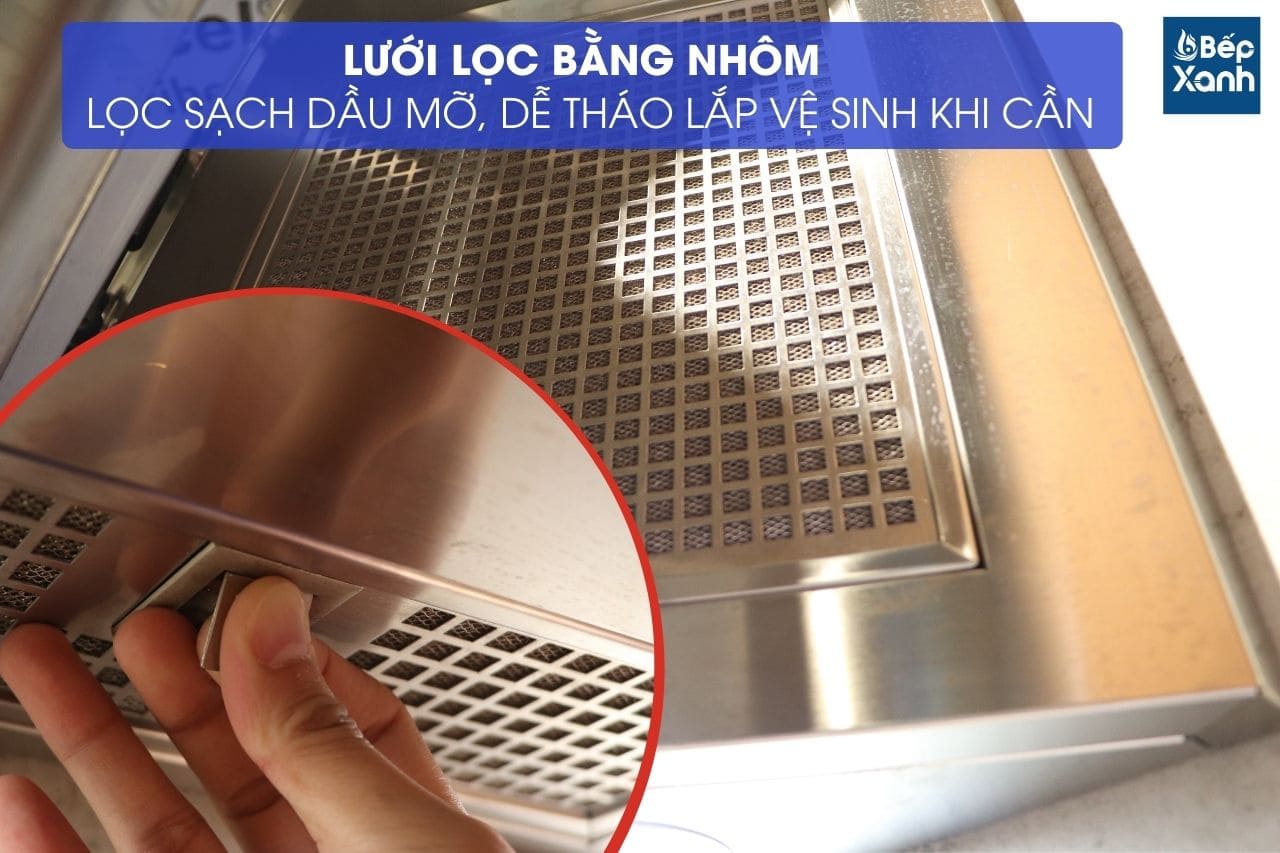 Lưới lọc hợp kim nhôm, dễ dàng tháo ra vệ sinh mọi lúc.