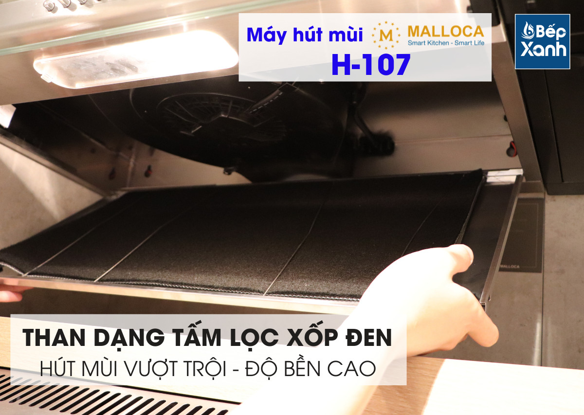 Ngoài khử mùi bằng ống dẫn được lắp đặt thoát ra ngoài, máy hút mùi H107 còn được trang bị than hoạt tính dạng tấm lọc xốp đen ở bên trong. Đây được xem là một ứng dụng trong bộ phận lọc mùi dành cho những thiết bị lọc mùi cao cấp. Than này có tác dụng khủ mùi triệt để, làm dịu đi mùi hôi ngay lập tức và giúp cho không gian bếp thông thoáng hơn trong quá trình nấu nướng.