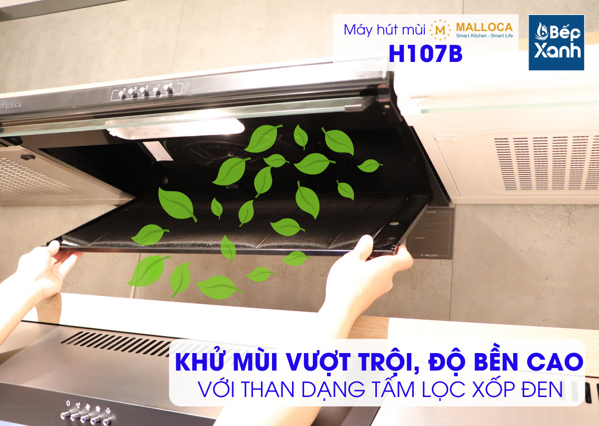 Ngoài khử mùi bằng ống dẫn được lắp đặt thoát ra ngoài, máy hút mùi H107B còn được trang bị than hoạt tính dạng tấm lọc xốp đen ở bên trong. Đây được xem là một ứng dụng trong bộ phận lọc mùi dành cho những thiết bị lọc mùi cao cấp. Than này có tác dụng khủ mùi triệt để, làm dịu đi mùi hôi ngay lập tức và giúp cho không gian bếp thông thoáng hơn trong quá trình nấu nướng. Thương hiệu Malloca nổi tiếng về chất lượng trong từng sản phẩm nên bạn sẽ không cần phải lo về độ bền của máy.
