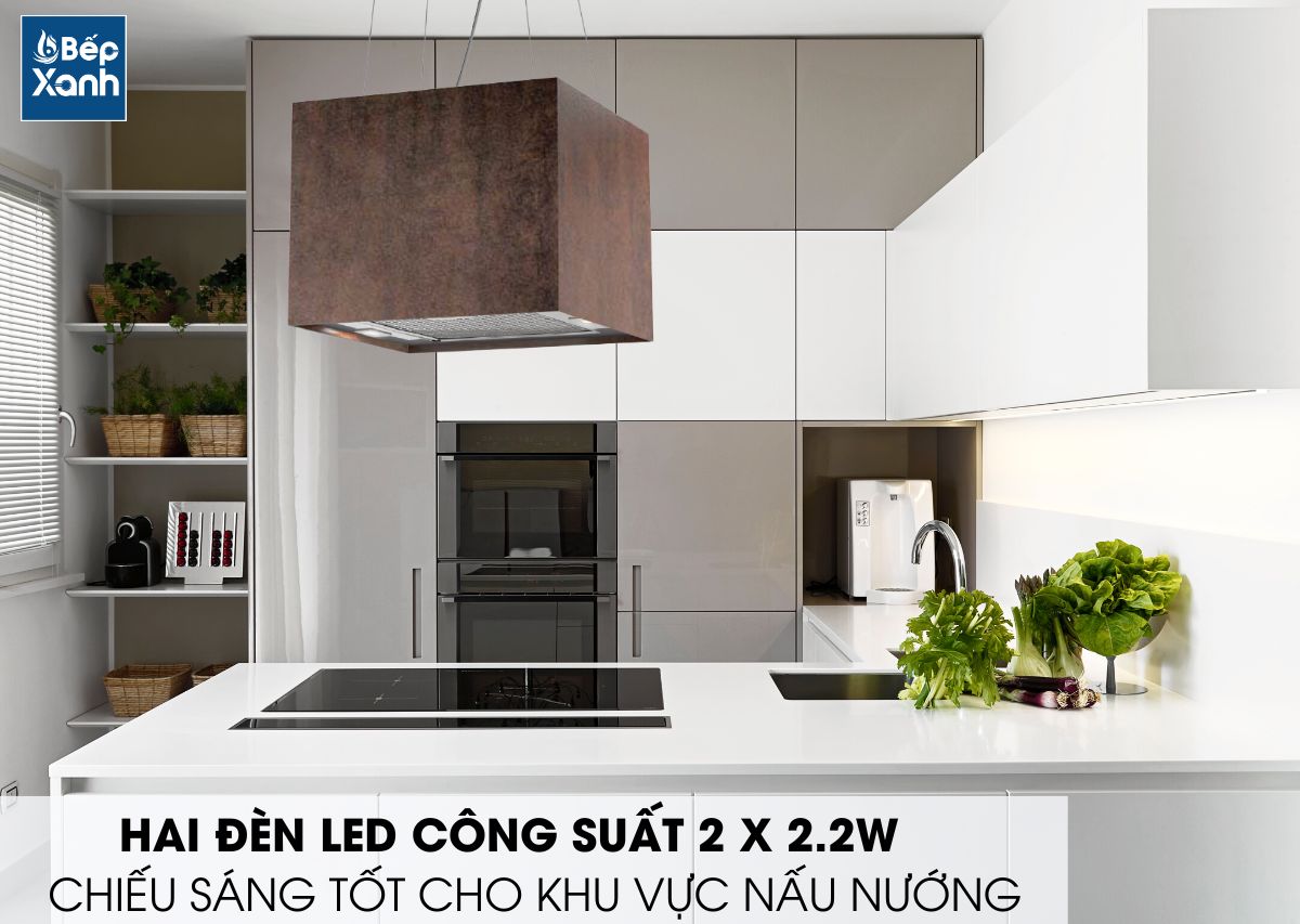 Thiết kế theo dạng hình hộp chữ nhật, Malloca CONCRETE K-400BR khi treo đảo sẽ giúp căn bếp nổi bật hơn bao giờ hết. Ngoài ra, 2 đèn LED còn giúp không gian bếp sáng hơn, ấm cúng hơn và dễ dàng nấu ăn vào ban đêm.