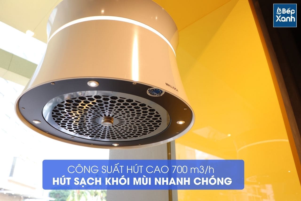 Sản phẩm có mức công suất cao lên đến 700 m3/h cho hiệu năng hoạt động bền bỉ, hút sạch mọi khói mùi, mang đến không khí trong lành cho gian bếp. Máy sử dụng điện nguồn 220-240 V/50 Hz nên rất tiết kiệm điện năng cho gia đình.