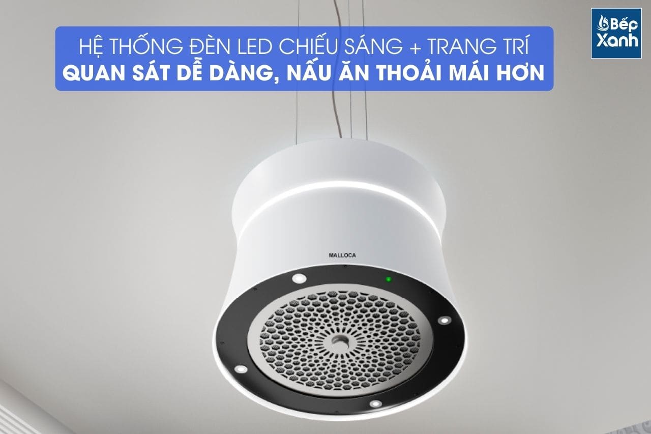 Máy hút mùi Malloca được trang bị hệ thống đèn LED vừa chiếu sáng tốt cho không gian nhà bếp, vừa có đèn trang trí đẹp mắt tăng độ sáng cho không gian bếp, mang tính thẩm mỹ cao cho khu vực nấu nướng. Chính điều này giúp bạn nấu nướng dễ dàng hơn, tạo cảm giác thư giãn vô cùng dễ chịu khi vào bếp.