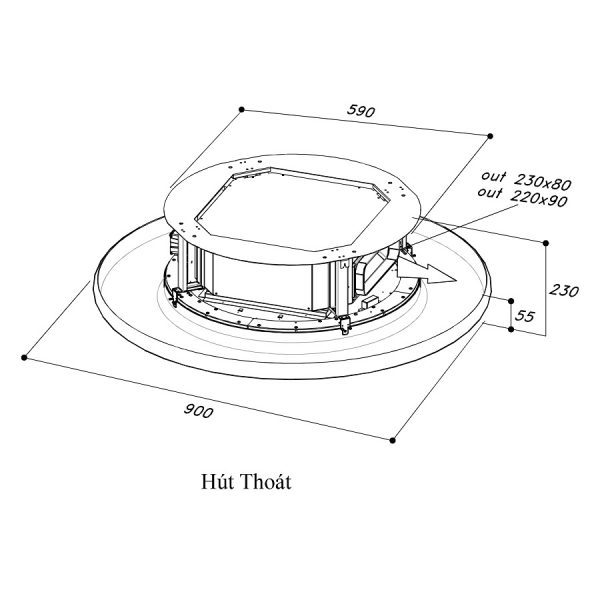 Máy hút mùi áp trần có động cơ và quạt hút thiết kế kiểu tuốc bin đôi hút đẩy 2 chiều được chế tạo từ nhôm Dura vật liệu chế tạo thân máy bay và dụng cụ thể thao hạng sang, cánh quạt chế tạo bằng nhựa ABS. Nhờ yếu tố này mà động cơ và cánh quạt có độ bền cao, trọng lượng nhẹ hơn, cộng suất lớn, tiết kiệm năng lượng. Điều khiển bằng remote 4 cấp độ và chức năng hẹn giờ tắt máy giúp người dùng thuận tiện hơn trong quá trình sử dụng.