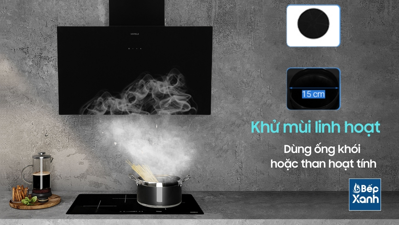 Máy hút mùi áp tường có thể sử dụng hút khử mùi trực tiếp bằng than hoạt tính, hoặc dùng ống thông gió, lắp đặt linh hoạt tùy theo thiết kế bếp