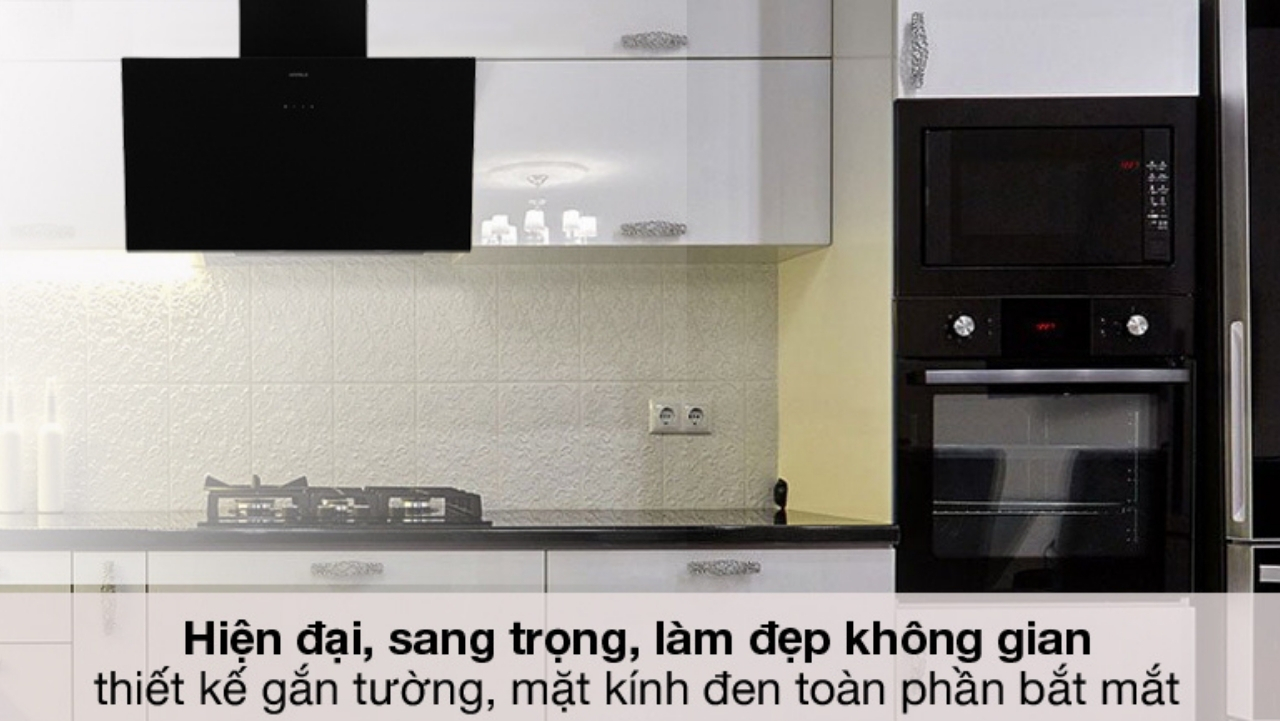 Máy hút mùi thiết kế chữ T gắn tường với mặt kính đen toàn phần sang trọng tạo điểm nhấn cho không gian bếp hiện đại.