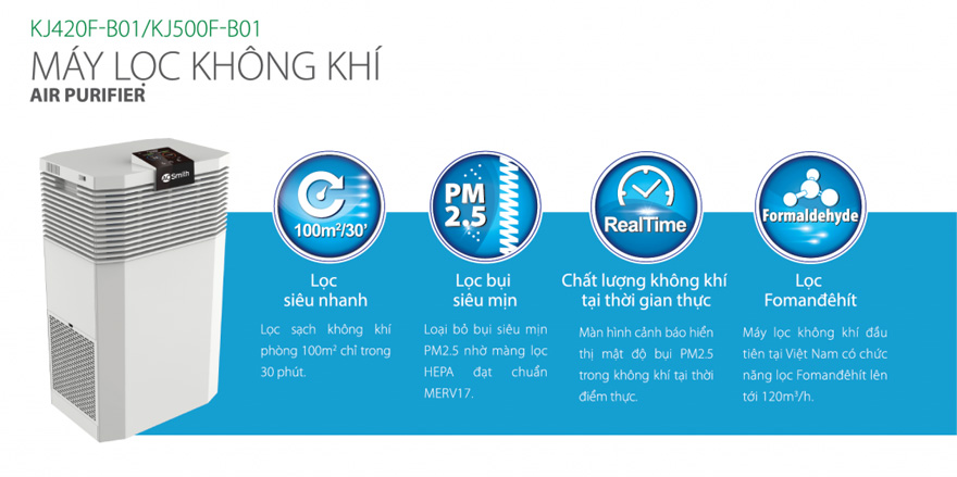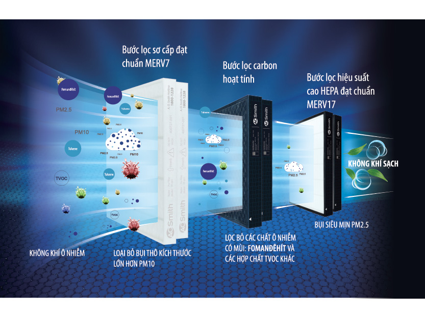 Thấu hiểu được sự ô nhiễm môi trường không khí tại Việt Nam, AO Smith cho ra đời dòng sản phẩm máy lọc không khí cao cấp (2 model cao cấp) với tiêu chuẩn lọc khí MERV17 cao cấp nhất thế giới. Máy lọc không khí đầu tiên sử dụng màng lọc HEPA cao cấp đạt tiêu chuẩn MERV17 được cấu thành bởi sợi thủy tinh và những lớp PP nén siêu mỏng, tạo nên khả năng lọc không khí cực hiệu quả của máy lọc không khí AO Smith KJ420F-B01, lọc sạch 99.97% các phân tử bụi siêu mịn PM2.5