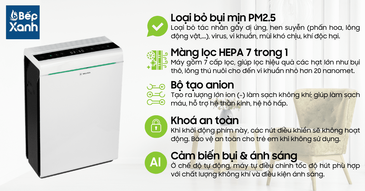Ngoài ra, Malloca MAP-07A còn được trang bị nhiều tính năng nổi bật khác như; màng lọc 7 lớp, bộ tạo ion âm hỗ trợ hệ hô hấp, cảm biến ánh sáng để điều chỉnh tốc độ hút phù hợp và khóa an toàn cho trẻ em.