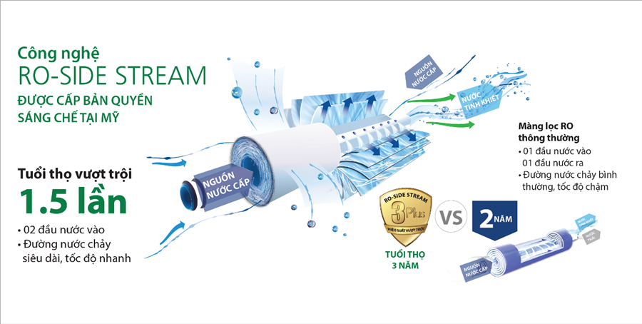 Công nghệ màng lọc RO – Side Stream, giúp tăng thêm 66% lượng nước tinh khiết, giảm 56% lượng nước thải, kéo dài tuổi thọ màng lọc trung bình hơn 1,5 lần. Với tỉ lệ nước lọc được 1:1, tức là 10 lít nước thô sẽ thu được 5 lít nước tinh khiết và 5 lít nước thường.