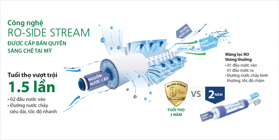 Màng lọc RO – Side Stream là phát minh đột phá của A. O. Smith, được cấp bản quyền sáng chế độc quyền tại Mỹ, giúp nâng cao hiệu suất sử dụng và kéo dài tuổi thọ lõi lọc. Màng lọc RO – Side Stream loại bỏ 99,9% kim loại nặng (Asen, chì, thủy ngân...) và các vi khuẩn có hại. Đặc biệt với màng lọc RO – Side Stream, A. O. Smith mang đến "Giải pháp tiết kiệm toàn diện" cho người sử dụng.