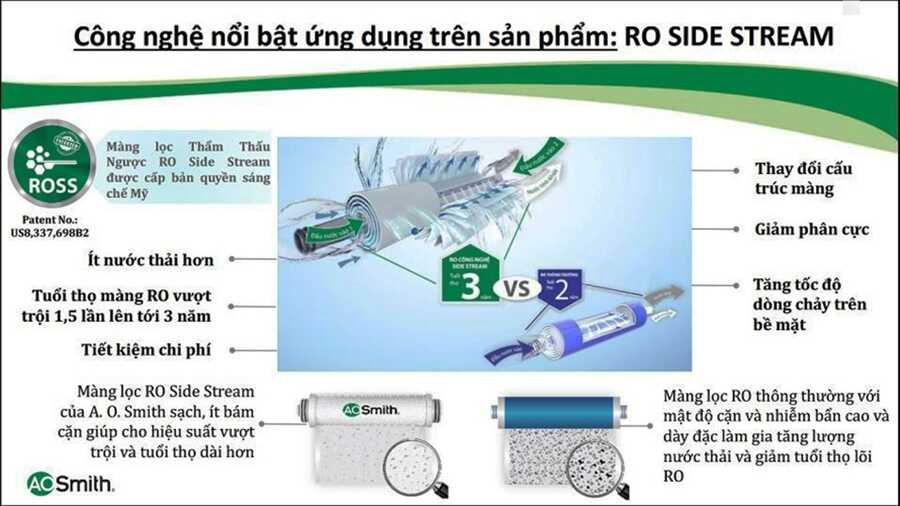 Với tôn chỉ "Sáng tạo làm nên Danh Tiếng”, A. O. Smith luôn tiên phong trong những phát minh và làm chủ công nghệ để phát triển các sản phẩm mang lại tiện ích cao nhất cho người sử dụng. Đến nay, AO. Smith đã sở hữu trên 140 bằng phát minh và sáng chế được đăng ký bản quyền trên toàn cầu. Đặc biệt, toàn bộ các dòng sản phẩm máy lọc nước tại Việt Nam được ứng dụng Công nghệ Màng lọc thẩm thấu ngược RO – Side Stream, Công nghệ đã được cấp bản quyền sáng chế độc quyền tại Mỹ (Patent No.US8,337,698 B2).