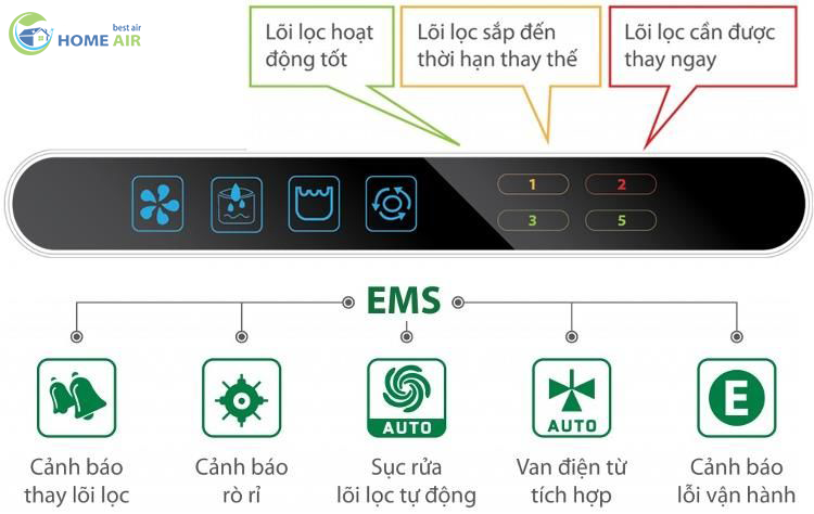 Màn hình cảnh báo thay thế lõi lọc: Căn cứ vào thực tế sử dụng – tiêu dùng nước tinh khiết, màn hình Led biểu tượng lõi lọc trên màn hình là màu xanh tức là lõi lọc hoạt động tốt, khi lõi lọc có hiện tượng cần phải thay thế lõi lọc thì trên màn hình của hệ thống sẽ hiển thị màu vàng để báo hiệu lõi lọc cần phải thay thế. Còn khi biểu tượng là màu đỏ thì lõi lọc lúc này cần được thay thế ngay lập tức để đảm bảo chất lượng nước đầu ra tốt nhất