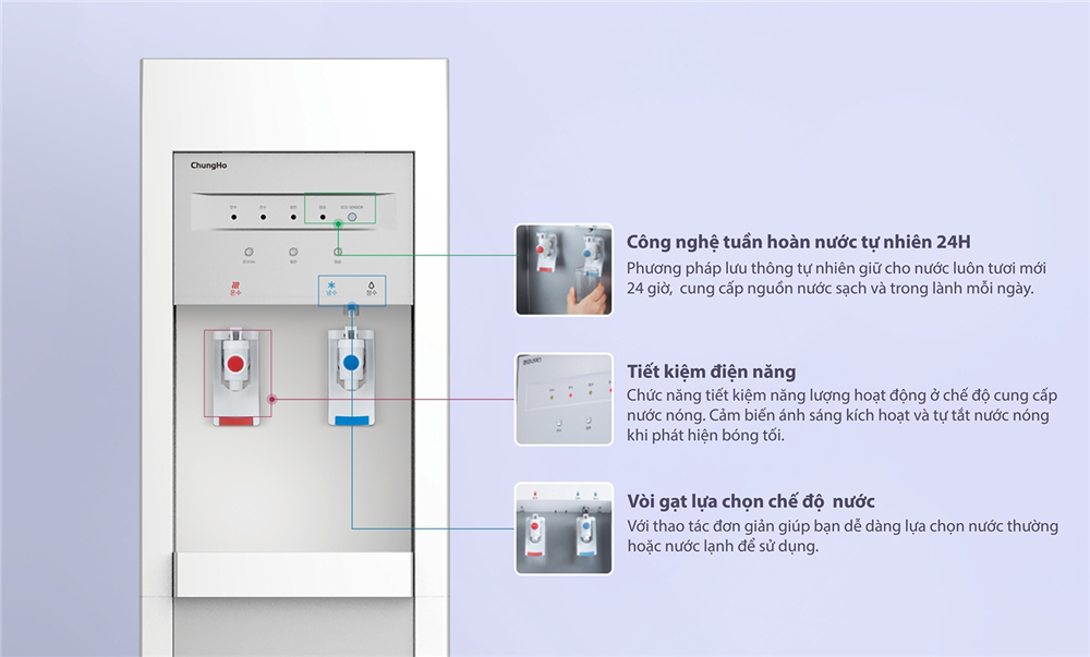 Chức năng | Cung cấp nước tinh khiết: Nóng, Lạnh, Thường | |