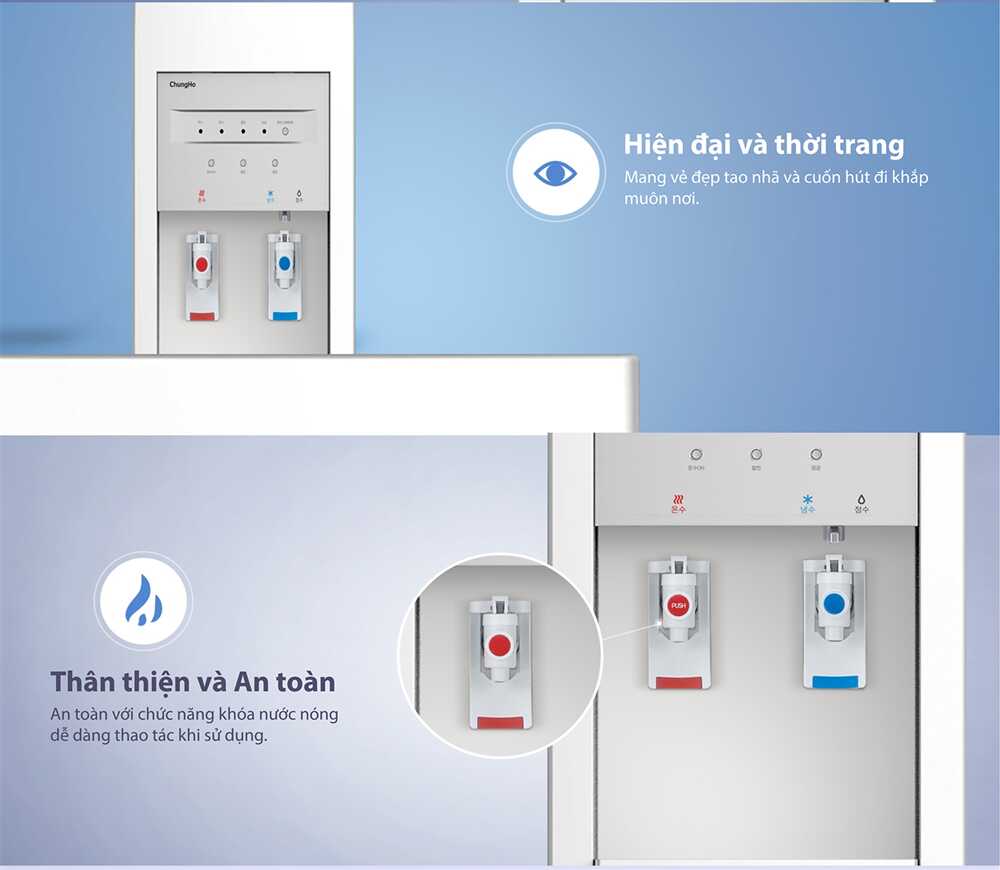 Sử dụng nút cảm ứng để cài đặt chức năng khóa. Khi đó nước nóng sẽ không được cung cấp và nút chọn lấy nước nóng sẽ không hoạt động giúp ngăn ngừa tình trạng bỏng nước nóng