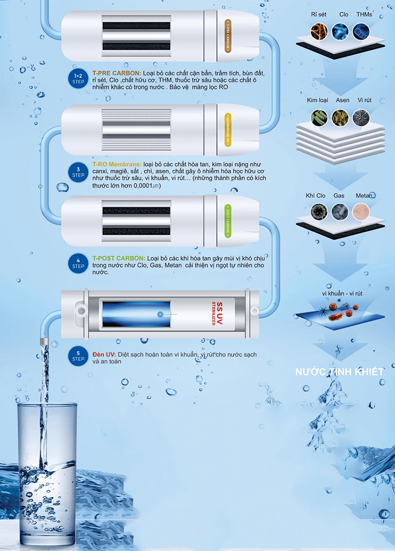 UV Diệt khuẩn | Diệt sạch 99.99 vi khuẩn có trong nước, đảm bảo cho nước sạch và an toàn để sử dụng. |