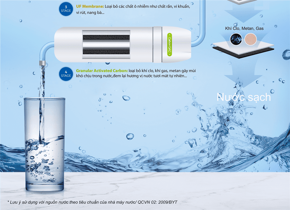 UF MEMBRANE: Bộ lọc có khả năng loại bỏ triệt để các chất ô nhiễm, chất rắn như sắt, chì, vi khuẩn, vv... là những chất gây hại cho sức khỏe (Thời hạn thay thế 12-18 tháng)