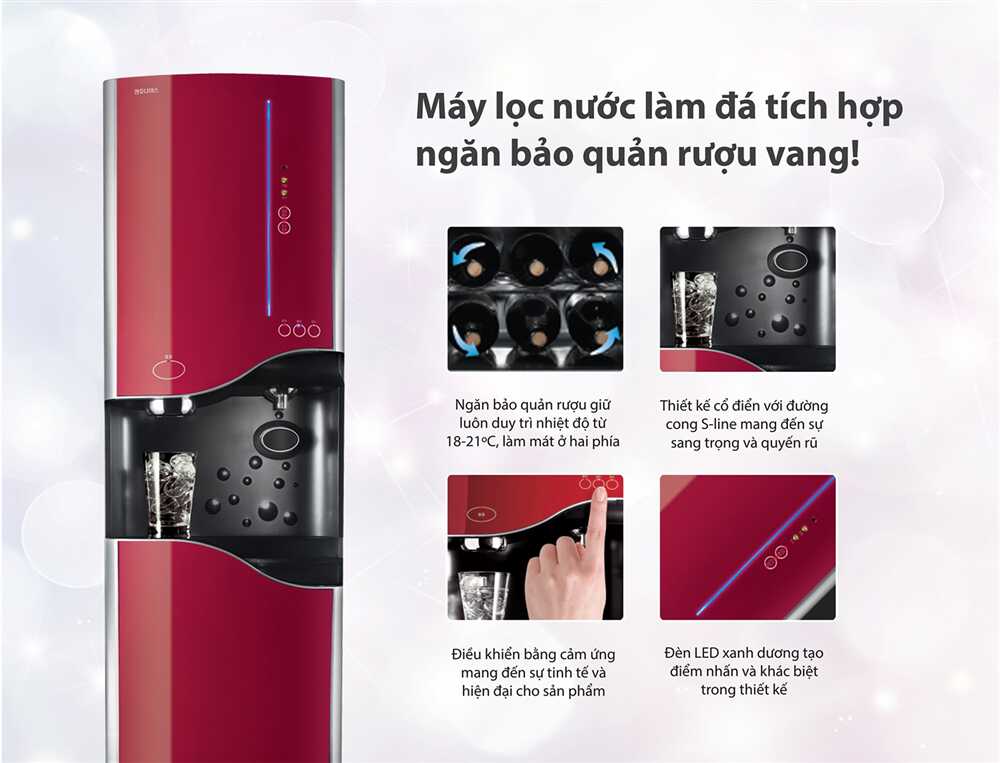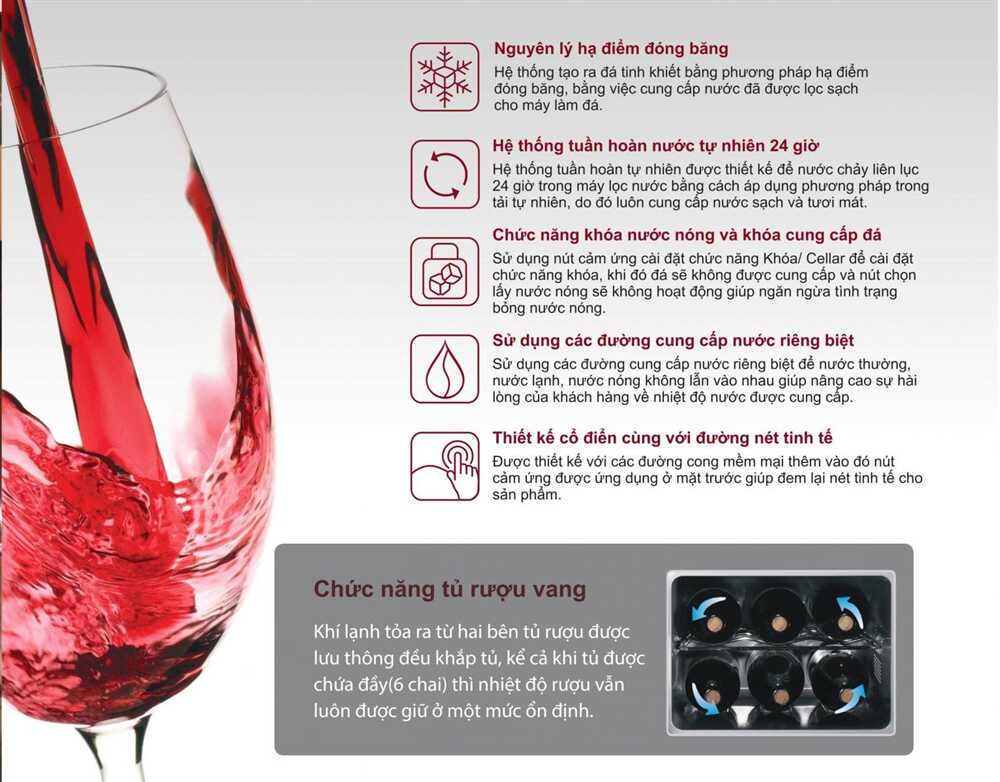 Chức năng | Cung cấp nước tinh khiết: Nóng, Lạnh, Thường, Làm đá, Bảo quản rượu vang (6 chai) | |