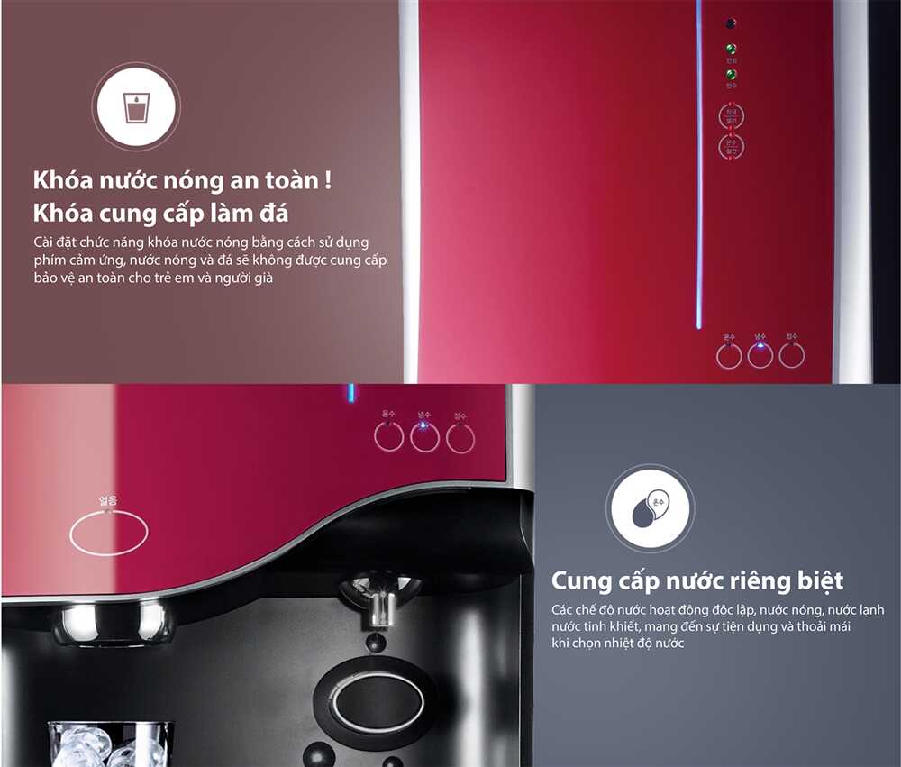 Sử dụng nút cảm ứng cài đặt chức năng Khóa/Cellar để cài đặt chức năng khóa. Khi đó đá sẽ không được cung cấp và nút chọn lấy nước nóng sẽ không hoạt động giúp ngăn ngừa tình trạng bỏng nước nóng.