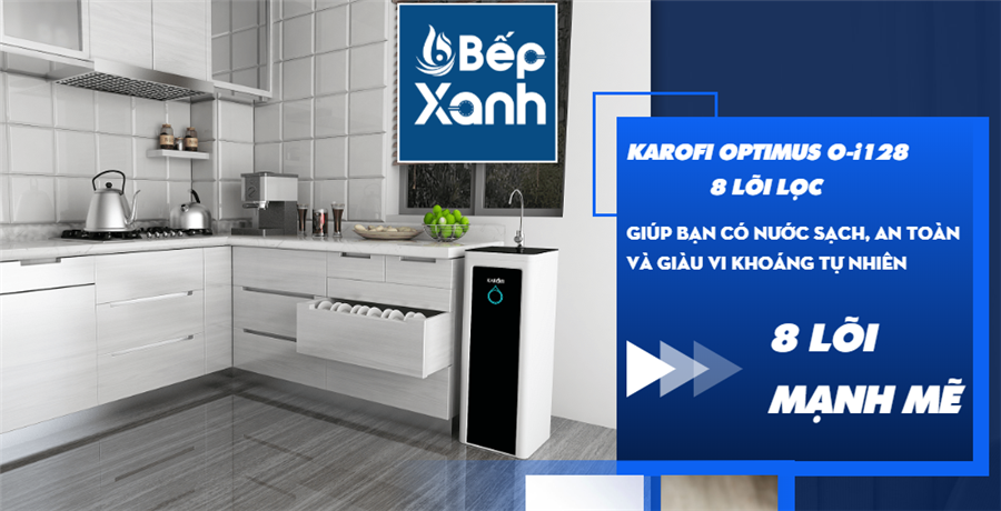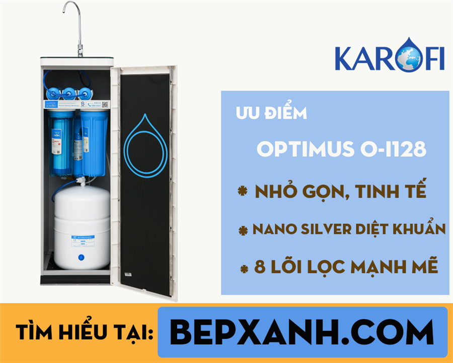 Karofi Optimus Oi-128 là dòng máy lọc nước thông minh, 8 lõi lọc, có tích hợp tính năng cảnh báo thay lõi lọc đến hạn. Nếu bạn đang muốn mua dòng máy lọc nước Karofi 8 lõi, có cảnh báo thay lõi, nhỏ gọn, thì dòng Karofi Optimus O-i128 là sự lựa chọn phù hợp, vừa có nước sạch, an toàn, vừa bổ sung khoáng chất. Model Optimus O-i128 có 8 lõi lọc, kém hơn Model O-i129/U lõi đèn UV, kém hơn Model O-i129/A lõi Alkaline.