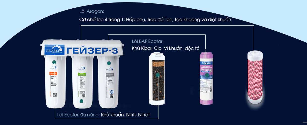 Bộ lọc nước trong máy Geyser Ecotar 3 có giá: 1.950.000đ /3 Lõi (Bao gồm VAT)