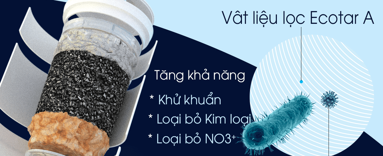 Với lõi số 1 là lõi Ecotar đa năng, giúp loại bỏ hiệu quả kim loại nặng, rỉ sét, cát sỏi và các dạng vật chất ở thể huyển phù và dạng keo.