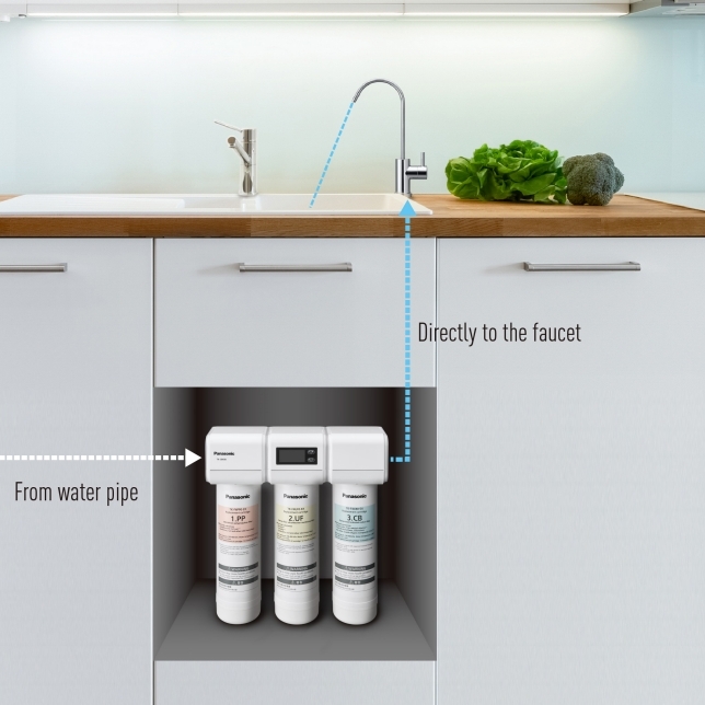 Bộ phận chính của máy lọc nước được lắp đặt bên dưới bồn rửa, giúp giái phóng nhiều không gian hơn cho kệ bếp. Với thiết kế không bình chứa, máy cho phép nước sạch tinh khiết chảy trực tiếp đến vòi. Không cần phải bảo dưỡng bồn chứa, bắt vít hoặc đi dây cấp điện.