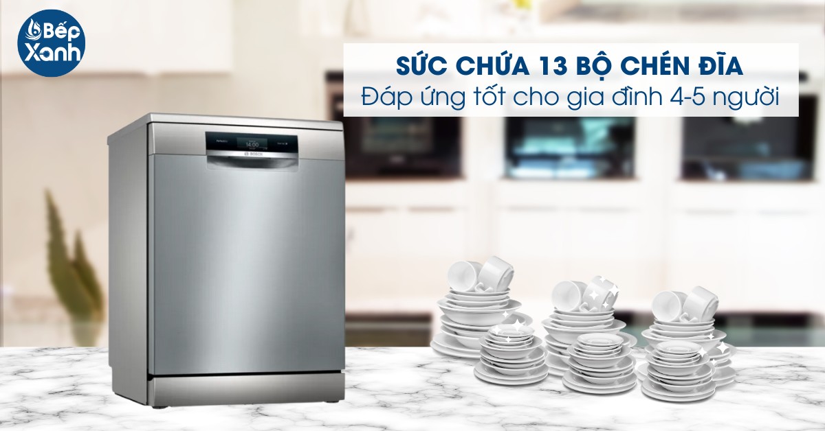 Với hiệu suất rửa lớn, máy rửa chén độc lập có thể rửa được 13 bộ chén đĩa châu Âu tương đương 3 - 4 bữa ăn của gia đình có 4 - 5 người Việt.