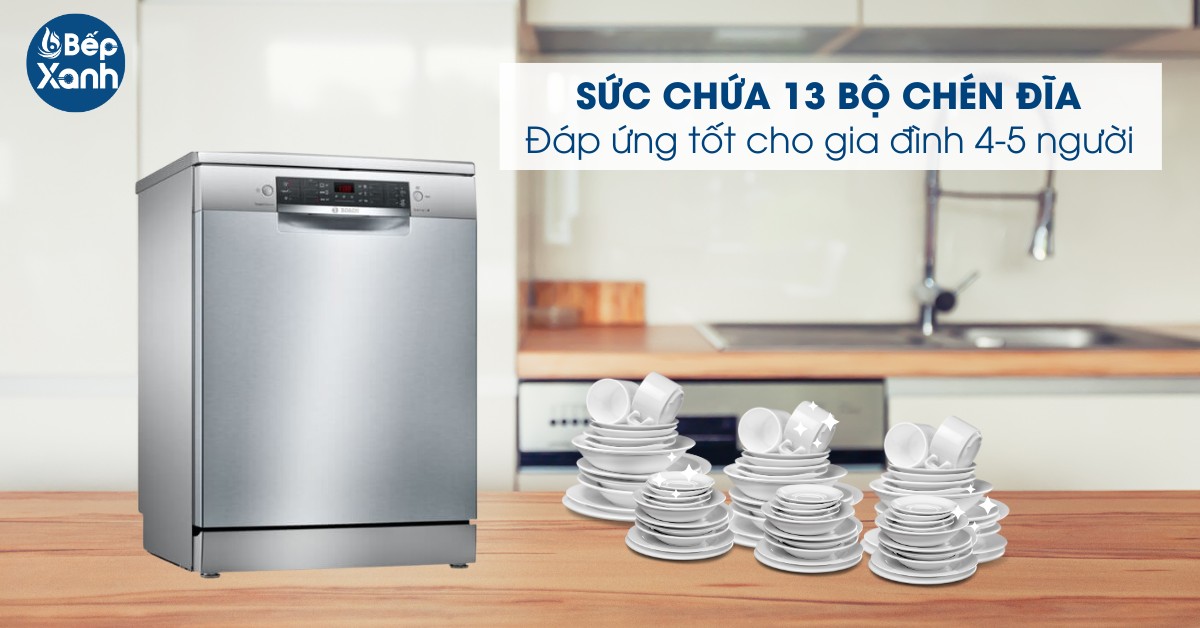 máy rửa chén độc lập có thể rửa được 13 bộ chén đĩa châu Âu tương đương 3 - 4 bữa ăn của gia đình có 4 - 5 người Việt.
