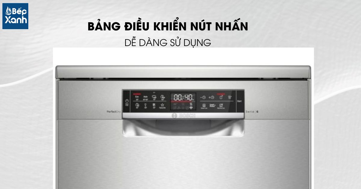 Bảng điều khiển của máy rửa chén Bosch series 4 được thiết kế đơn giản và dễ thao tác với dạng nút nhấn điện tử. Người dùng có thể dễ dàng lựa chọn các chương trình rửa và điều chỉnh các tùy chọn khác một cách thuận tiện. Màn hình LED nhỏ trên bảng điều khiển cung cấp thông tin chi tiết về thời gian còn lại của chương trình rửa, chế độ hoạt động của máy, và các thông báo khác, giúp người dùng dễ dàng quan sát và điều khiển hoạt động của máy một cách thuận tiện. Điều này giúp người dùng có trải nghiệm sử dụng máy rửa chén đĩa Bosch SMS4ECI14E dễ dàng và hiệu quả.