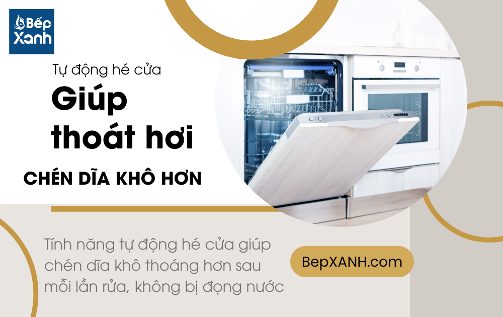 Một số máy rửa chén hiện đại có tính năng tự động hé cửa, giúp tiện lợi và an toàn cho người dùng trong quá trình sử dụng. Tính năng này thường được thiết kế để tự động mở cửa của máy rửa chén sau khi chu kỳ rửa hoàn thành, giúp cho chén đĩa được tự nhiên khô trong quá trình cửa máy được hé ra. Tính năng tự động hé cửa thường hoạt động dựa trên cơ chế điều khiển tự động, thông qua cảm biến hoặc các chương trình điều khiển của máy rửa chén. Sau khi chu kỳ rửa hoàn thành, cửa của máy sẽ tự động hé ra một cách êm dịu, giúp thông gió và giúp chén đĩa khô nhanh hơn.
