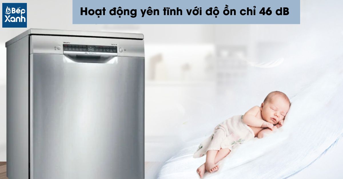Một trong những đặc điểm nổi bật của máy rửa chén Bosch SMS4IVI01P là độ ồn thấp, chỉ 46 dB. Điều này đồng nghĩa với việc máy hoạt động êm ái, không gây ra tiếng ồn lớn khi đang rửa chén đĩa. Đặc biệt, với độ ồn này, bạn có thể hoàn toàn thoải mái sử dụng máy rửa chén trong những khung giờ đêm muộn hoặc gần khu vực nơi người khác đang nghỉ ngơi mà không gây phiền nhiễu. Điều này đồng nghĩa với việc bạn có thể tận hưởng không gian yên tĩnh trong gia đình mà vẫn đảm bảo sự sạch sẽ của chén đĩa mà không bị ảnh hưởng bởi tiếng ồn từ máy rửa chén.