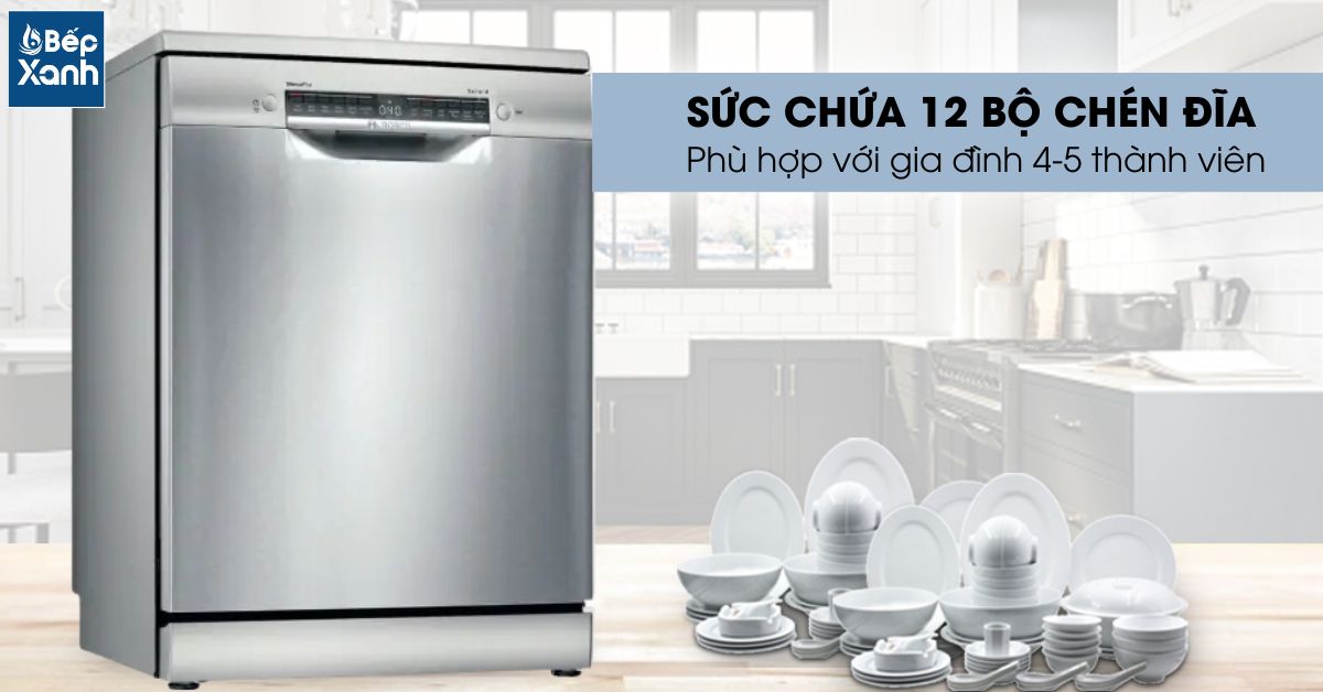 Máy rửa chén đĩa Bosch SMS4IVI01P không chỉ đáp ứng nhu cầu rửa chén bát cho gia đình có từ 4 - 5 thành viên một cách dễ dàng, mà còn mang lại nhiều tiện ích cho người dùng. Với khả năng chứa đến 12 bộ chén đĩa châu Âu, máy rửa chén Bosch cung cấp đủ không gian để bạn có thể rửa sạch mọi dụng cụ bếp như xoong, chảo, nồi với kích cỡ phù hợp. Sau khi tích hợp hệ thống lọc 3 lớp tối ưu lượng nước rửa, lượng nước tiêu thụ trong 1 lần rửa giảm xuống chỉ khoảng 9.5 lít nước.
