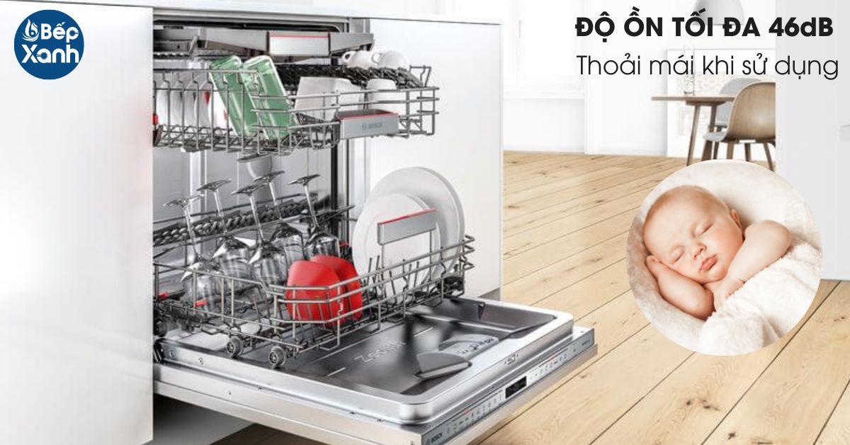 Máy rửa chén Bosch được thiết kế với hệ thống giàn rửa bên trong rộng rãi và thoải mái để đựng các loại bát, đĩa và dụng cụ nấu ăn với kích cỡ khác nhau một cách dễ dàng. Bạn không cần phải lo lắng về việc bát đĩa sẽ không vừa hoặc không thể rửa sạch do không đủ chỗ để đựng. Máy có thể rửa khoảng 3 - 4 bữa ăn Việt (tương đương 14 bộ chén đĩa châu Âu) một lần duy nhất, giúp tiết kiệm thời gian và năng lượng của bạn. Hoạt động êm ái với độ ồn thấp