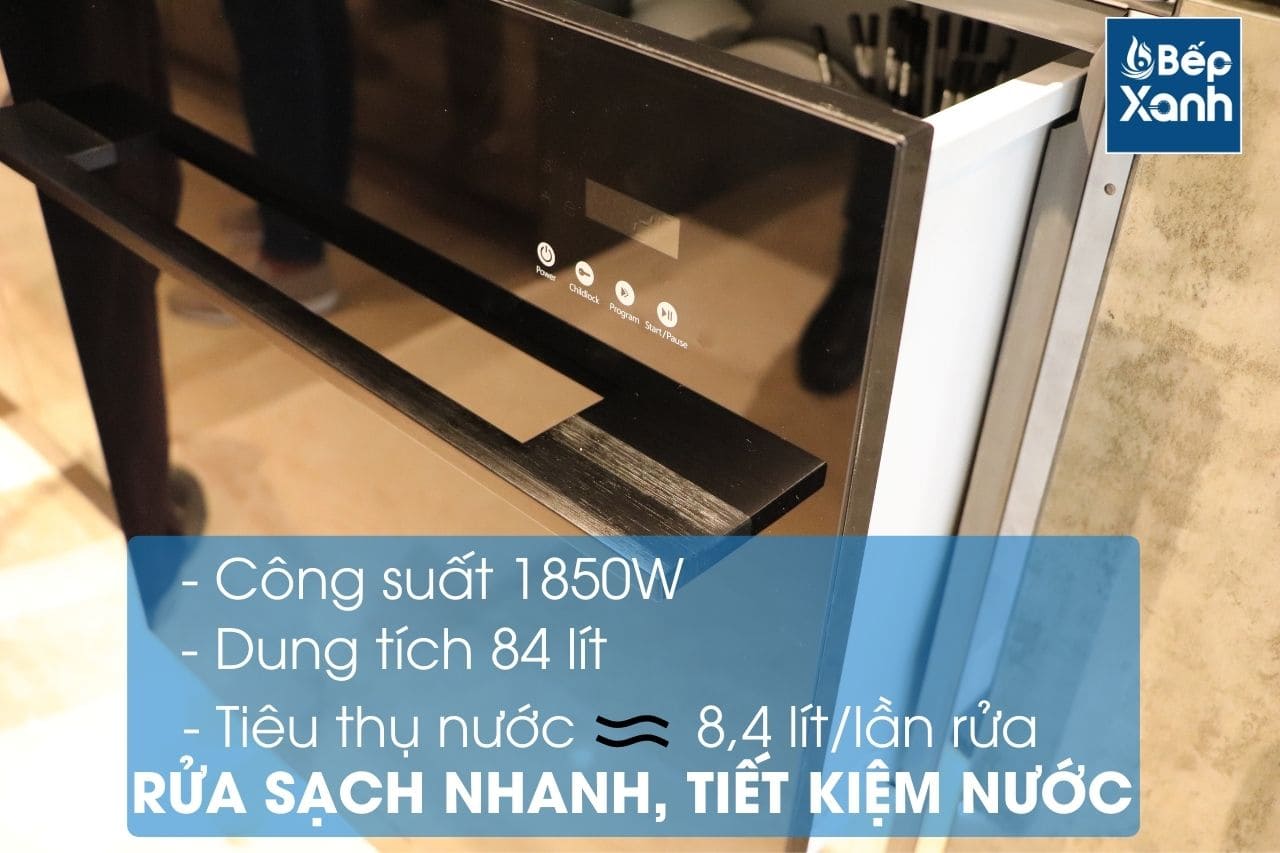 Lượng nước tiêu thụ tối đa của máy cho mỗi lần sử dụng là 8,4 lít, tiết kiệm nước hơn rất nhiều so với khi rửa chén bát bằng tay thông thường.