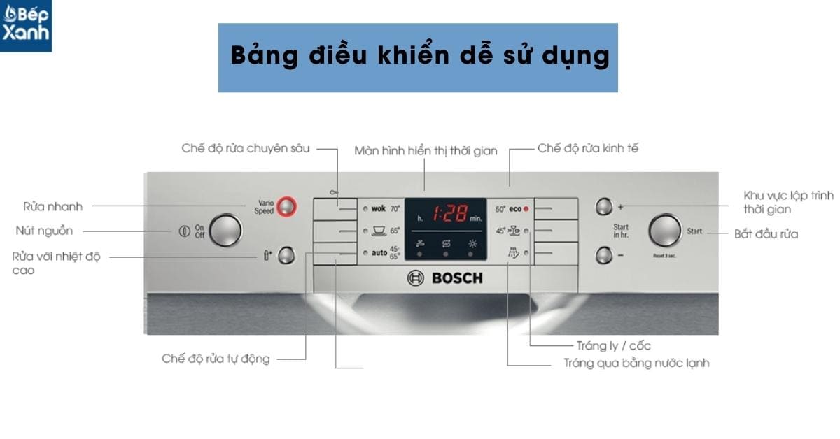 Bảng điều khiển có nhiều chức năng dễ dàng sử dụng, bạn chỉ cần nhấn nút điều khiển chọn chương trình phù hợp, cho viên rửa chén vào khay và bấm nút start là được. Trên màn hình sẽ hiển thị thời gian rửa.