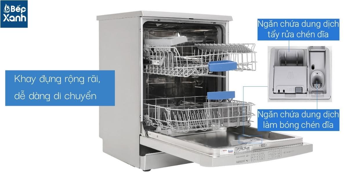 Máy rửa chén Bosch rửa bát đĩa nhanh chóng, tiện lợi với khay đựng rộng rãi, số lượng 12 bộ bát đĩa. Rổ đựng dế dàng kéo dài ra, di chuyển lên xuống, thuận tiện khi sử dụng.