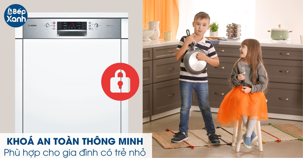 Việc kích hoạt khoá trẻ em trên máy rửa chén Bosch seri 4 sẽ giúp đảm bảo an toàn cho trẻ nhỏ trong gia đình và tránh việc trẻ em tò mò vô tình tác động hoặc mở máy trong lúc hoạt động.