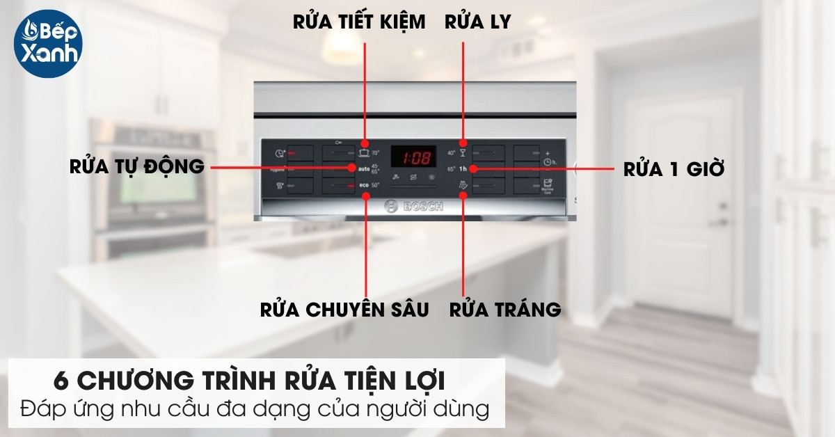 - Được thiết kế với tính linh hoạt cao, Bosch serie 4 có thể thiết lập 6 chương trình rửa cài đặt sẵn tùy thuộc vào nhu cầu sử dụng của người dùng, giúp làm sạch nhiều loại chén bát và đồ dùng một cách thuận tiện, tiết kiệm công sức và thời gian: Rửa 70 ° C, Auto 45-65 ° C, Eco 50 ° C, 40 ° C Glass, Rửa 1h 65 °C, Rửa tráng.