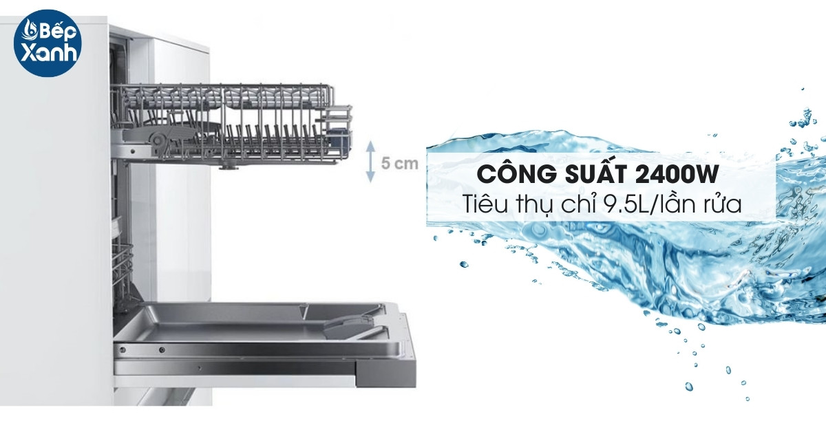 - Mức tiêu thụ nước cho 1 lần rửa chỉ khoảng 9.5 lít cực kỳ tiết kiệm, không tốn quá nhiều lượng nước như việc rửa chén thông thường nhưng vẫn đảm bảo hiệu suất hoạt động.