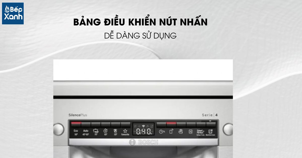 Bảng điều khiển của máy rửa chén Bosch SMS4EVI14E series 4 được thiết kế dạng nút nhấn điện tử, đơn giản và dễ thao tác, giúp người dùng dễ dàng lựa chọn các chương trình rửa và điều chỉnh các tùy chọn khác. Màn hình LED hiển thị nhỏ trên bảng điều khiển cung cấp thông tin chi tiết về thời gian còn lại của chương trình rửa, chế độ hoạt động của máy, và các thông báo khác, giúp người dùng dễ dàng quan sát và điều khiển hoạt động của máy một cách tiện lợi.