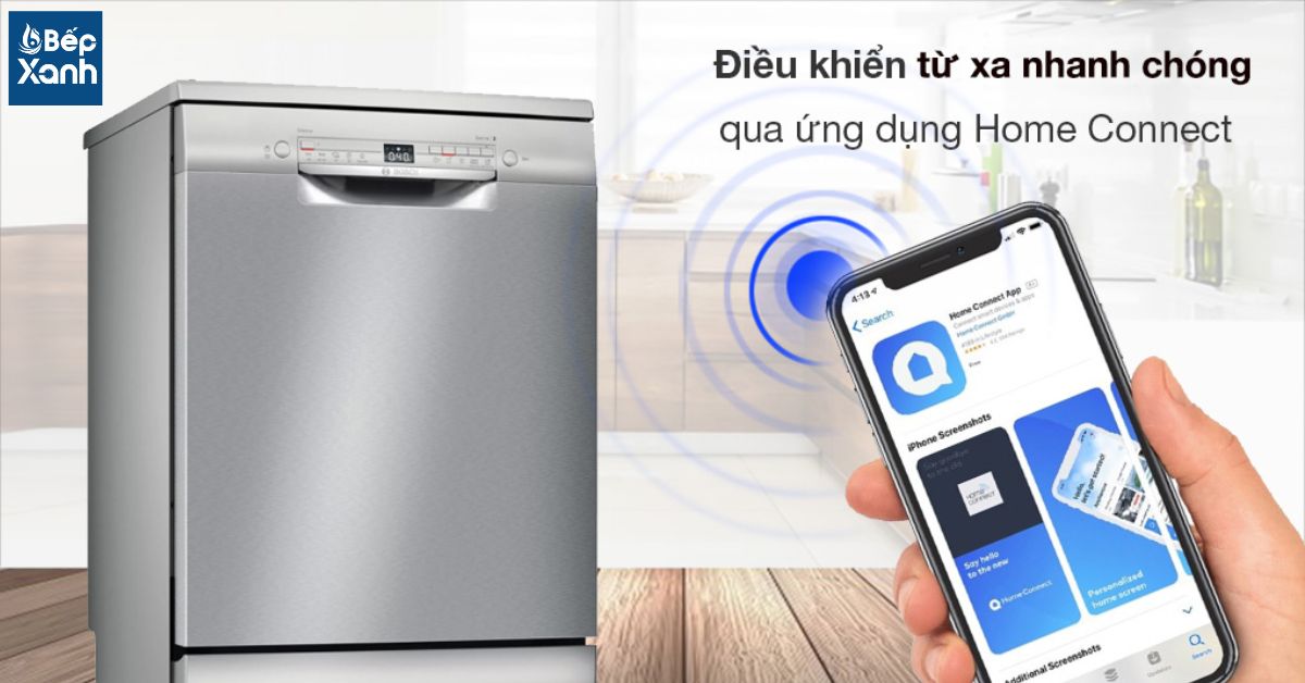 Chương trình Auto: Đây là chương trình tự động, máy sẽ tự động điều chỉnh nhiệt độ, áp lực nước, thời gian rửa để đạt được kết quả rửa tối ưu dựa trên độ bẩn của chén đĩa.Máy rửa chén độc lập Bosch SMS4EVI14E cung cấp tính năng điều khiển từ xa thông qua ứng dụng Home Connect, cho phép người dùng có thể kiểm soát và quản lý hoạt động của máy từ bất kỳ đâu bằng smartphone của mình. Điều này mang lại tính tiện lợi và linh hoạt cho người dùng, giúp họ có thể quản lý tình trạng hoạt động của máy rửa chén một cách dễ dàng.