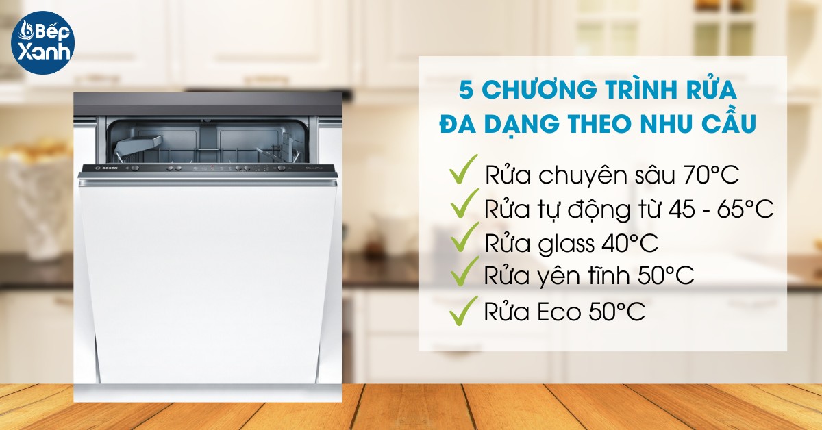 - Máy rửa chén Bosch seri 2 được thiết kế với tính linh hoạt cao, sản phẩm có thể thiết lập 5 chương trình rửa cài đặt sẵn tùy thuộc vào nhu cầu sử dụng của người dùng, giúp làm sạch nhiều loại chén bát và đồ dùng một cách thuận tiện, tiết kiệm công sức và thời gian: Intensive 70°, Auto 45° - 65°, Glass 40°, Eco 50°, Quiet 50°.