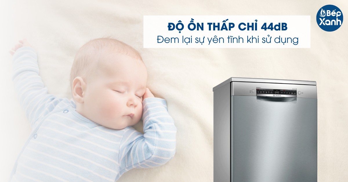 Máy rửa chén hoạt động êm ái với mức độ ồn chỉ 44 dB. Điều này được đạt được nhờ sử dụng động cơ không chổi than, giúp giảm ồn hiệu quả. Âm thanh phát ra từ máy giống như tiếng thì thầm hoặc tiếng mưa nhẹ, không gây khó chịu ngay cả khi sử dụng trong không gian yên tĩnh.