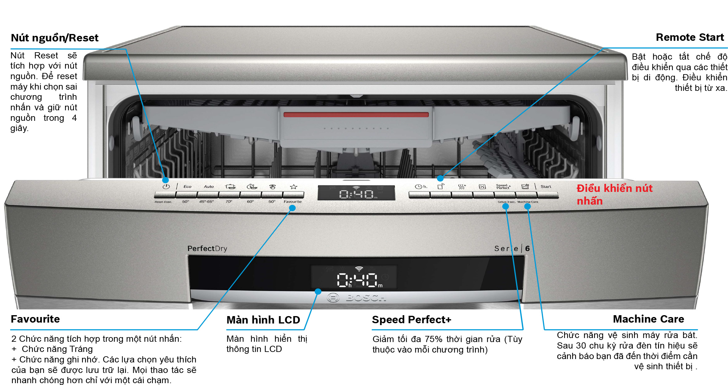 Machine Care: Tự động chạy một chuỗi quá trình rửa đặc biệt, sử dụng các chất tẩy rửa và nhiệt độ cao để làm sạch và khử trùng các phần của máy. Điều này giúp ngăn chặn sự hình thành cặn bẩn, vi khuẩn và mảng bám, đồng thời duy trì hiệu suất và độ bền của máy rửa chén.