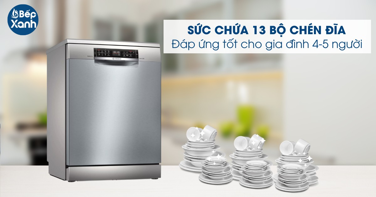 Máy rửa chén Bosch SMS6ZDI48E serie 6 có công suất 2400W, cho phép rửa 3-4 bữa ăn Việt (tương đương với 13 bộ châu Âu).