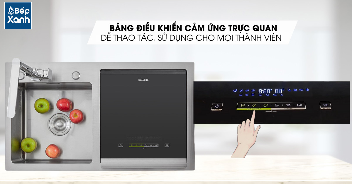 Máy rửa chén tích hợpchậu rửa được hãng Malloca thiết kế nhỏ gọn và tiện lợi, kiểu dáng lắp âm hiệnđại giúp tiết kiệm diện tích. Bên trái là hộc chậu rửa được chế tạo bán thủ công với các góc cạnh và bề mặt Inox được xử lý một cách sắc sảo và tinh tế. Ngoài ra chậu rửa chén được trang bị lỗ chờ tiện lợi có thể sử dụng để chứa bình đựng xà bông giúp việc rửa chén được tiết kiệm thời gian hơn cùng với đó là bộ xả rác thông minh ngăn mùi hiệu quả. Bên phải là máy rửa chén được thiết kế bằng mặt kính đen sang trọng. Bảng điều khiển bằng cảm ứng kết hợp với màn hình LCD hiển thị trực quan dễ sử dụng.