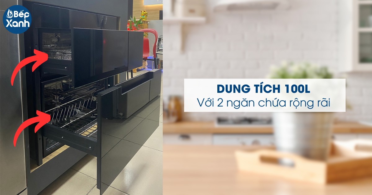 Dung tích lớn đến 100 lít giúp sấy được nhiều bát đĩa cùng lúc