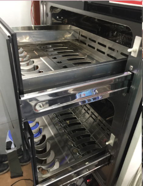 - Phải đợi cho quá trình tiệt trùng hoàn tất, đèn báo sẽ tắt sau hai mươi phút mới có thể mở và lấy chén đĩa ra sử dụng. Sau 30 ngày, ta có thể vệ sinh các vỉ đỡ vật dụng một lần bằng cách tháo rời ra ngoài, dùng vải mềm (có thể cho một ít nước rửa chén) lau nhẹ, để thật khô rồi mới lắp trở lại vào máy.