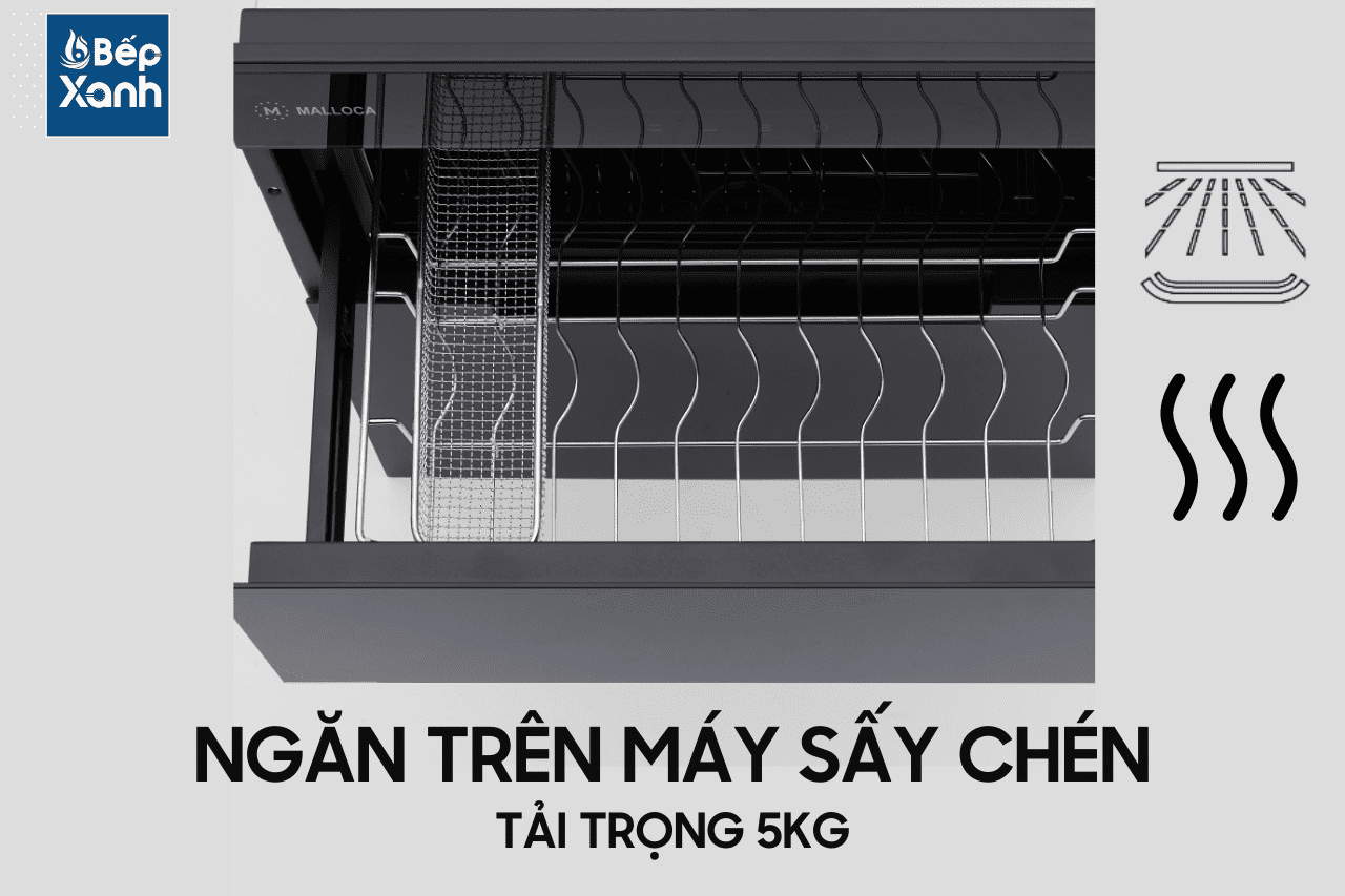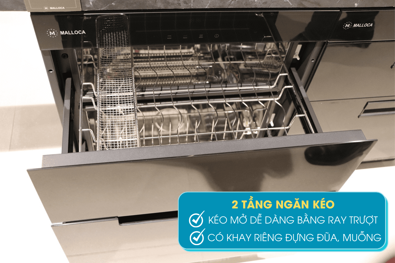 Đáp ứng cho nhu cầu sử dụng của gia đình nhiều thành viên, máy sấy-tiệt trùng chén đĩa Mallcoa MS-1005 sở hữu 2 ngăn kéo rộng rãi, tải trọng lên đến 11kg đồng thời sấy được nhiều bát đĩa cùng một lúc. Đặc biệt, ngăn trên còn có thêm khay riêng để đựng muỗng nĩa rất gọn gàng.